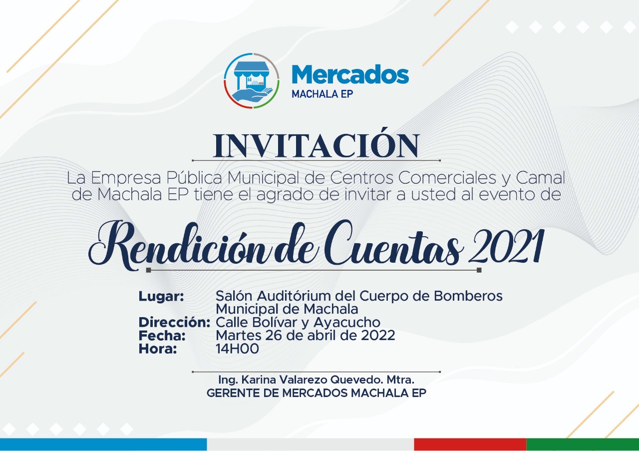 Mercados Machala EP, pone a disposición de la ciudadanía el informe de rendición de cuentas 2022, en el que se detallan las actividades y proyectos ejecutados durante este periodo, con el fin de que la ciudadanía realice sus comentarios y sugerencias, tal como lo estipula la Ley de Participación Ciudadana y Control Social